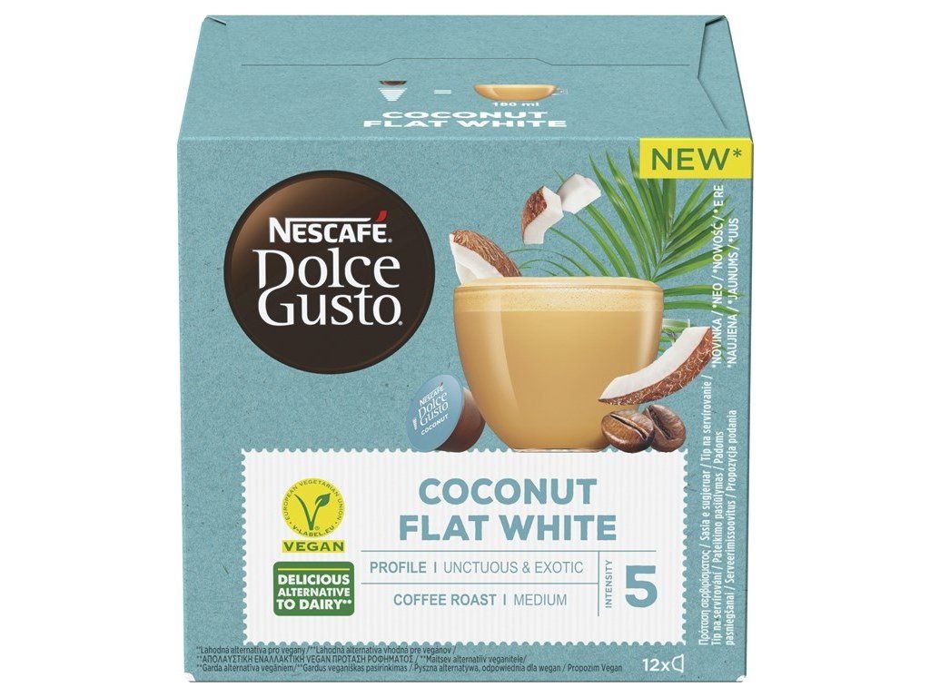 * Objevte NESCAFÉ® Dolce Gusto® Coconut Flat White, lahodnou alternativu mléčných produktů pro vegany. Naši odborníci na kávu skvěle vyvážili chuť neobvyklých exotických tónů kokosových ořechů a aromatických kávových tónů z pečlivě vybrané směsi kávových zrn z jihovýchodní Asie.